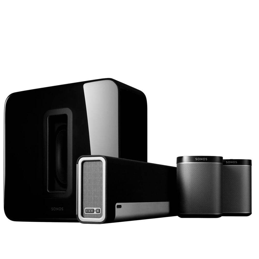 Our best Home Theater experience including a Sonos PLAYBAR, Wireless SUB, and 2 PLAY:1s for surround sound rears. PLAYBAR compliments HD television screens with crisp and powerful sound from nine amplifed speaker drivers. SUB connects wirelessly and adds dramatically deeper bass allowing you to hear parts of the music or TV show you’ve never heard before. Two PLAY:1 speakers connect wirelessly as surround sound rears allowing you to hear every last detail of your music, movies, and games. Feel like you’re in the center of the action with vivid sonic details coming at you from every direction